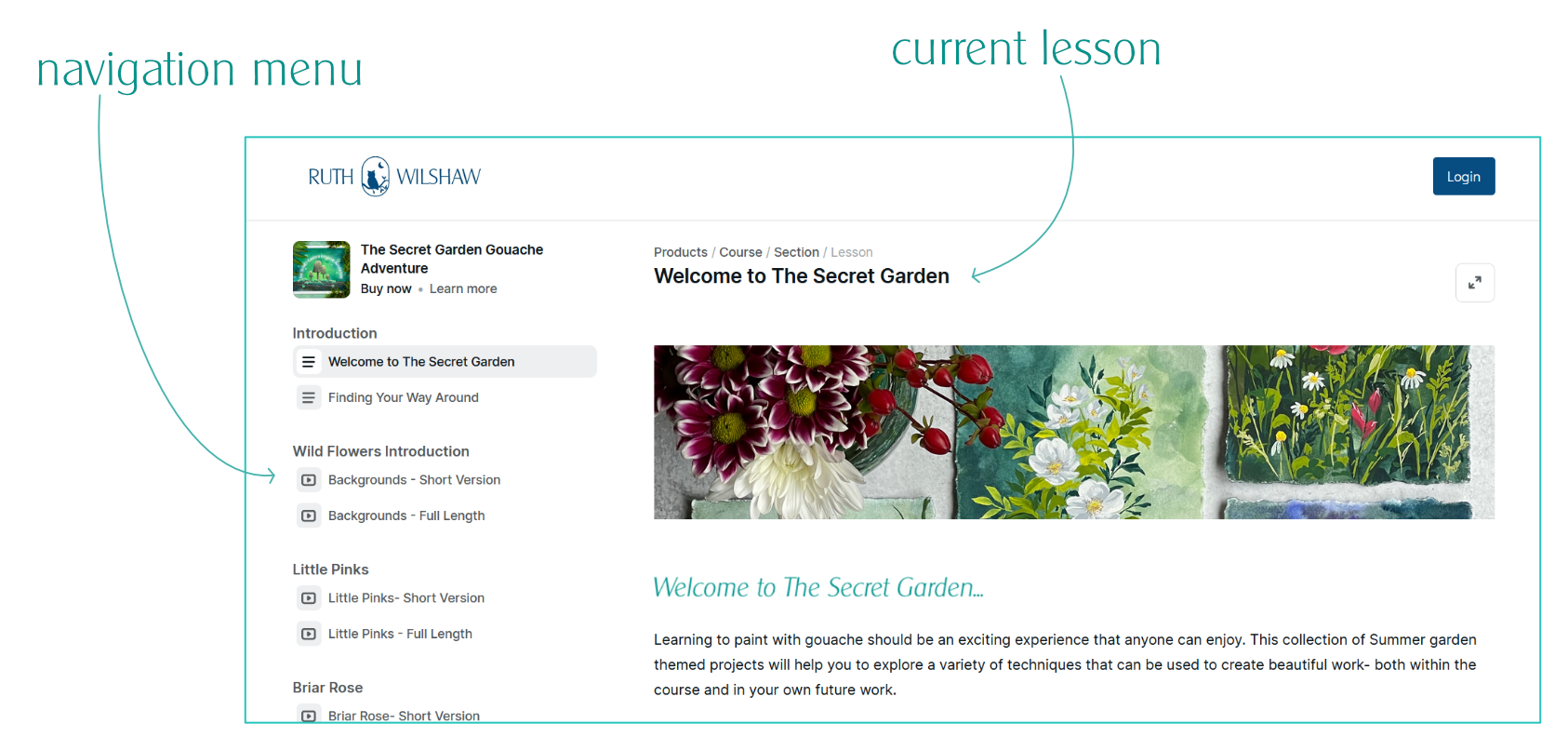 You can move between the lessons using the navigation bar on the left side of the screen and you have a choice of short or real-time versions of each project; this is great for when you want to check out what's involved before sitting down to paint!