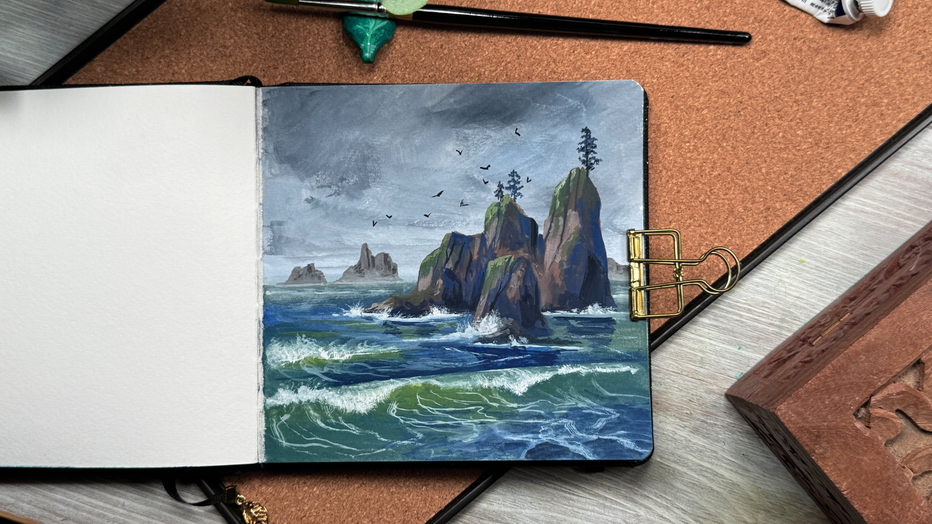 A rugged rock formation rising from a restless sea, battered by waves and wrapped in moody skies.
