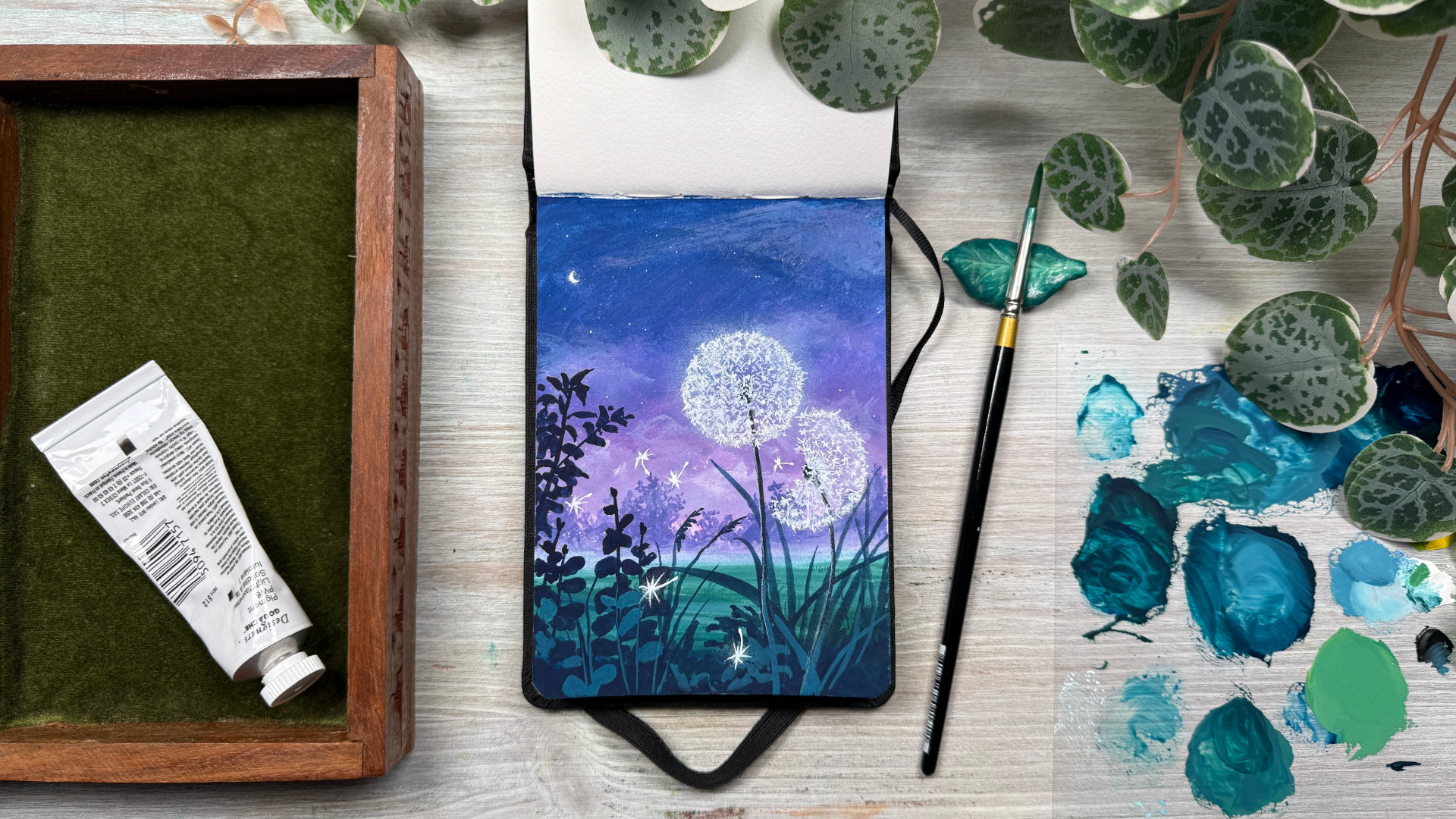 In this tutorial, we'll be painting this pretty night scene full of glowing dandelion wishes.